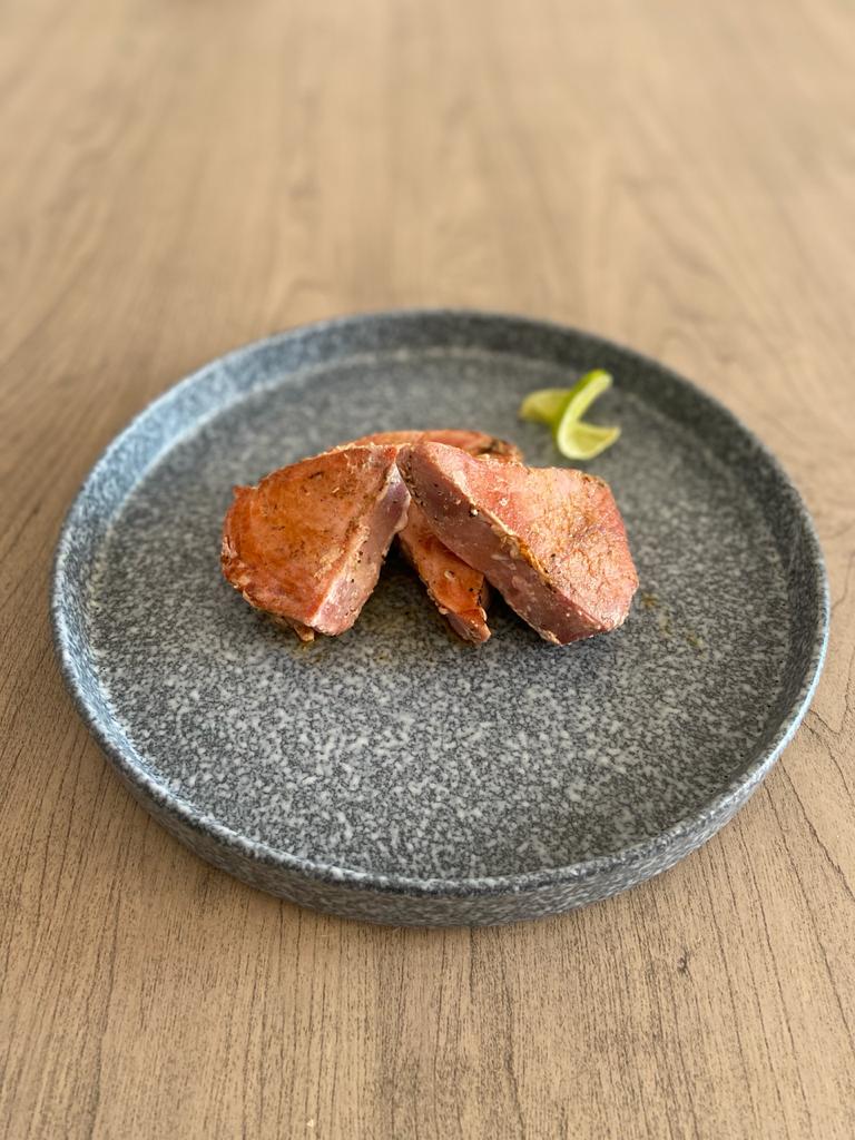 200 gr de lonja de atún a la parrilla con sal, pimienta y un toque de aceite de oliva.
