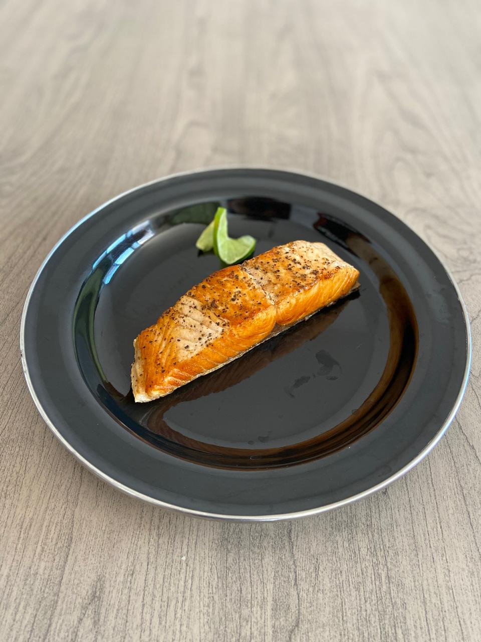 200 gr de lonja de salmón a la parrilla con sal, pimienta y un toque de aceite de oliva.